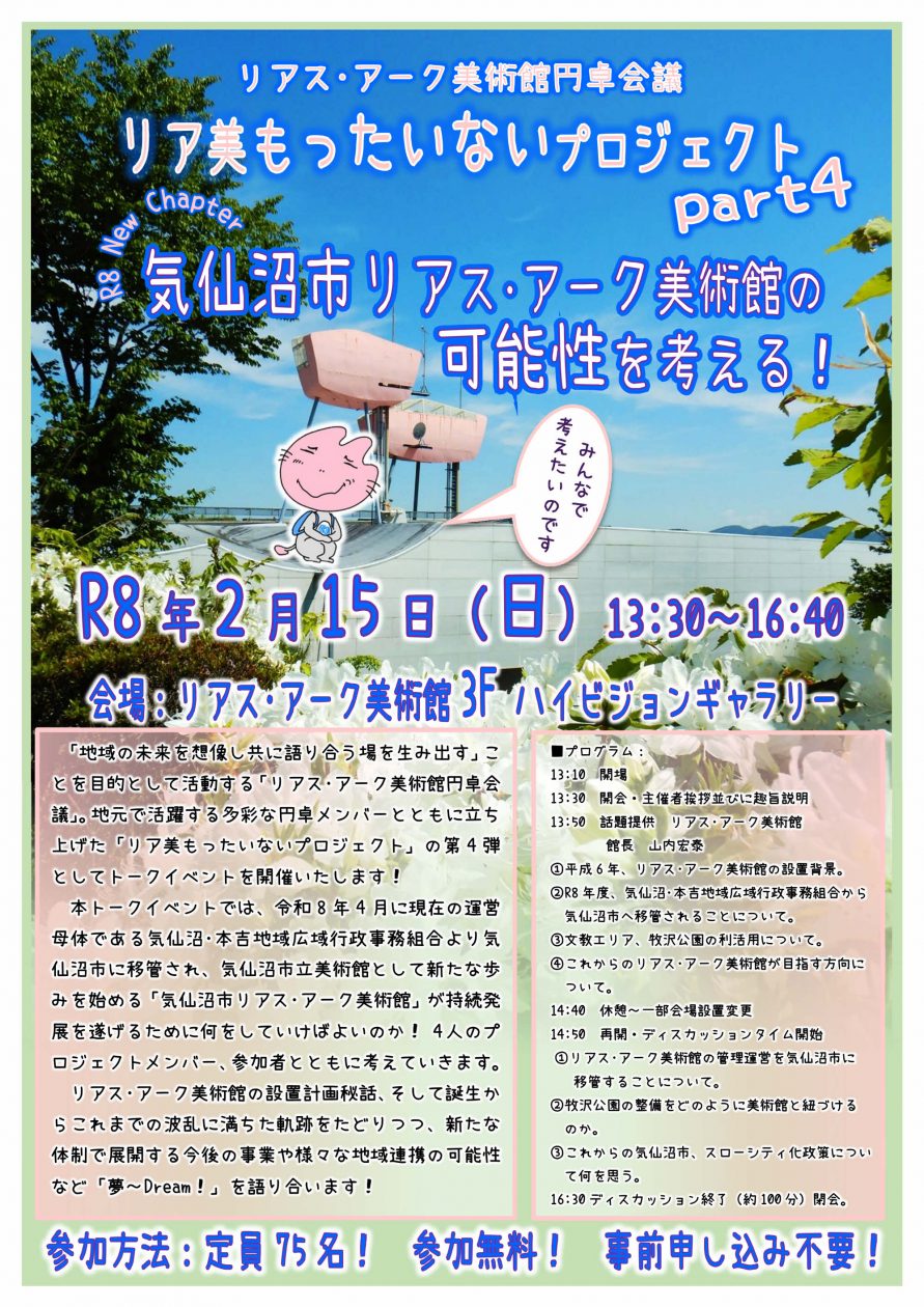 本トークイベントでは、令和8年4月に現在の運営母体である気仙沼・本吉地域広域行政事務組合より気仙沼市に移管され、気仙沼市立美術館として新たな歩みを始める「気仙沼市リアス・アーク美術館」が持続発展を遂げるために何をしていけばよいのか! 4人のプロジェクトメンバー、参加者とともに考えていきます。